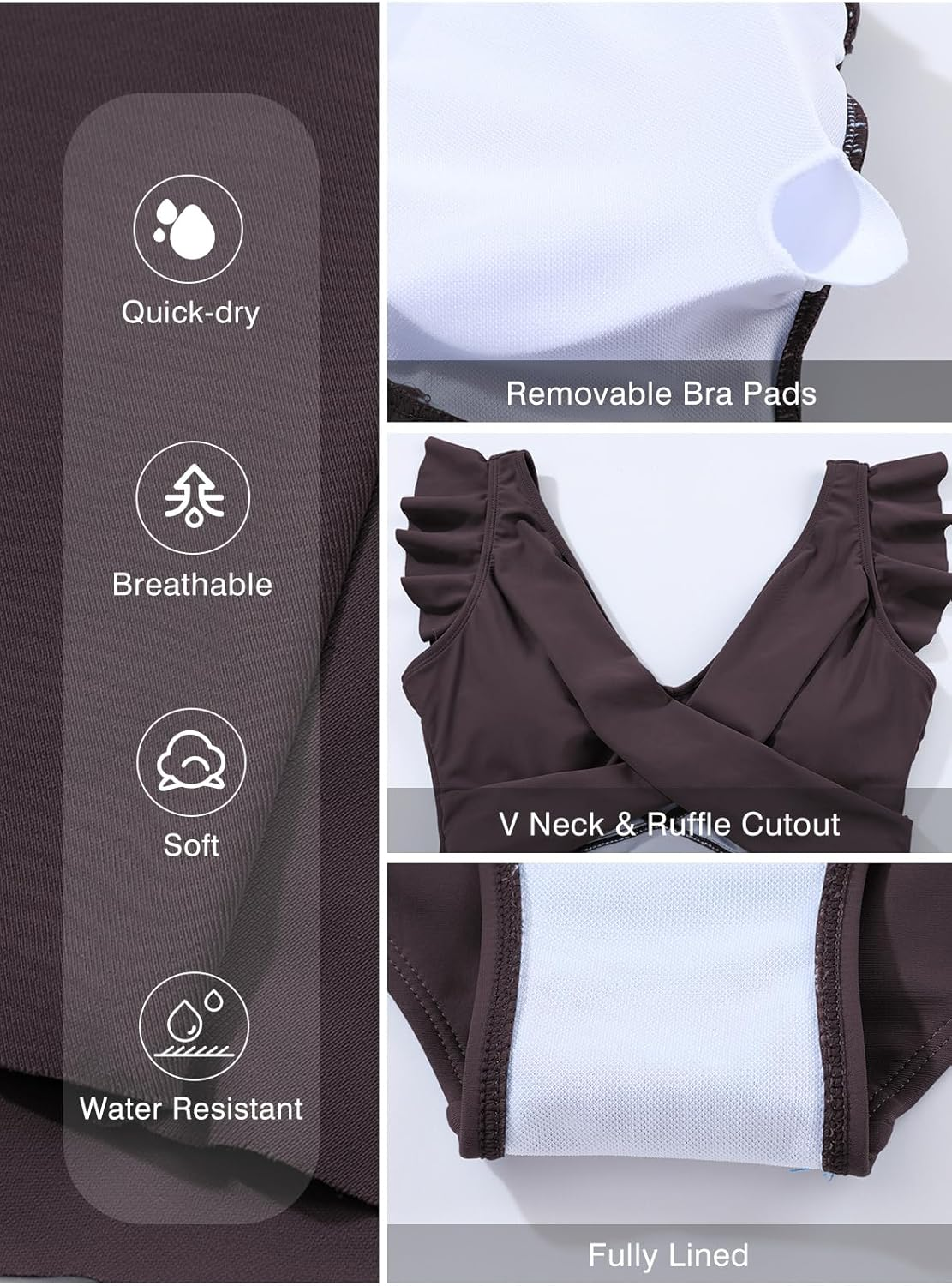 Push up one piece swimsuits for women: Removable bra pads and front cross design add bust supports and push up bust. Ruffle sleeve makes arms look more slender. Make you look more elegant